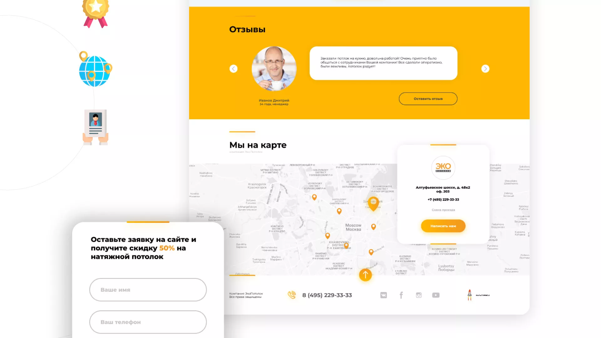 В нашем портфолио в Жиздре Вы можете найти большое количество вариантов готовых сайтов, среди которых есть и сайты по натяжным потолкам. Все проекты выполнены с учётом пожеланий заказчиков, многие из которых стали нашими друзьями.